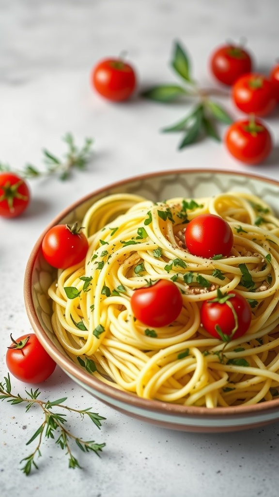 - Serve: Plate the dish and garnish with cherry tomatoes for an added pop of color and sweetness. Enjoy your fresh and vibrant Vegan Aglio e Olio with Zucchini Noodles!