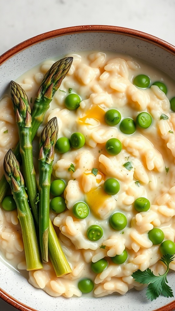 - After about 10 minutes of cooking, toss in the asparagus and peas. Continue to add broth and stir until the rice is creamy and al dente, about 15-20 minutes total.