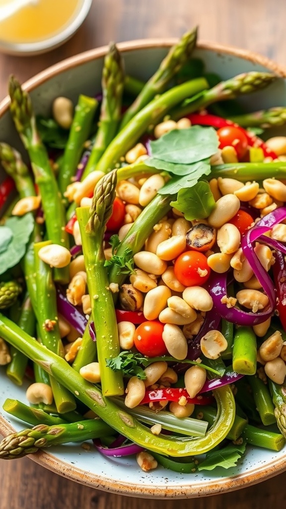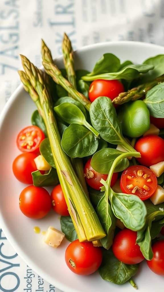 - Assemble the Salad: In a large bowl, combine the asparagus, cherry tomatoes, spinach, and feta cheese. Drizzle with the lemon vinaigrette and toss gently to coat all ingredients.