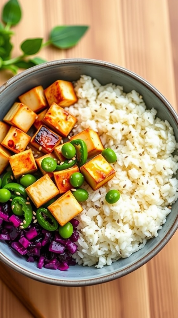- Assemble the Bowl: In a serving bowl, place the cooked rice at the bottom. Top with the cooked tofu, edamame, and red cabbage. Garnish with chopped green onions, sesame seeds, and fresh basil.