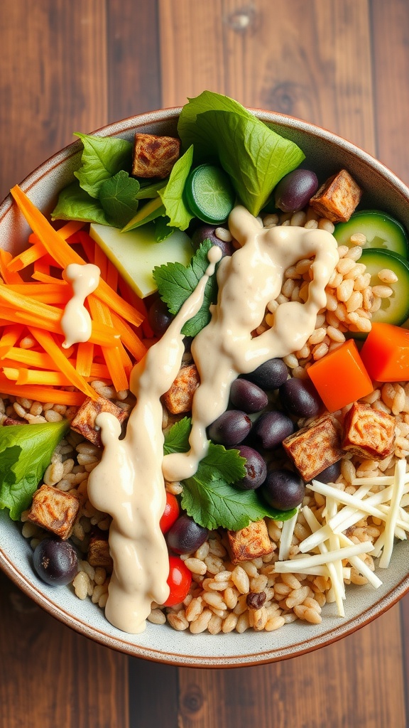 - Assemble the Bowl: In a large bowl, layer the cooked grains, chickpeas, and fresh vegetables. Drizzle with the tahini dressing and toss gently to combine.