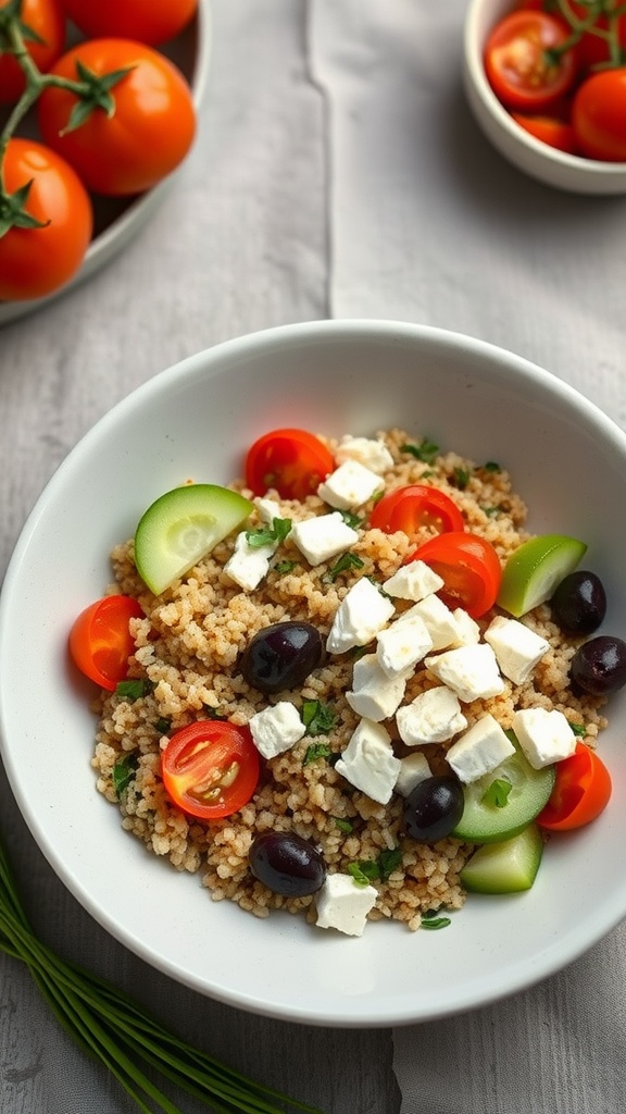 The zesty flavors of cherry tomatoes, crisp cucumbers, and briny olives come together beautifully, offering a healthy and filling meal. You can easily customize it by adding your favorite ingredients, from grilled chicken to roasted chickpeas. Enjoy this colorful bowl for lunch or dinner!
