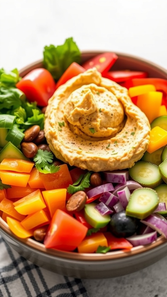 - Add Hummus: Spoon the hummus in the center of the bowl or on the side for dipping.