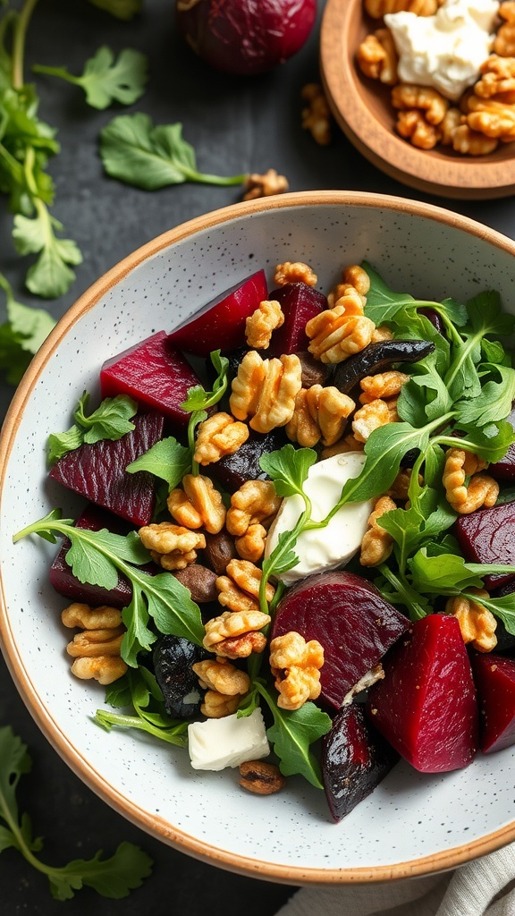 Combining fresh greens with roasted beets creates a vibrant and appealing presentation. The tangy goat cheese adds a wonderful creaminess, while the walnuts provide a satisfying crunch that rounds out the dish. This bowl is not only simple to prepare but also offers a gourmet touch without the fuss!