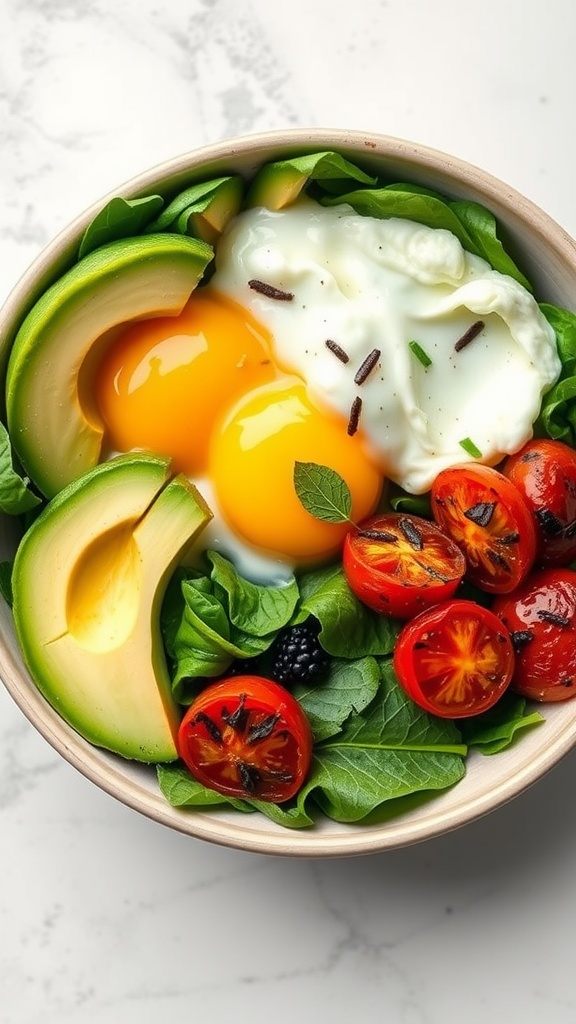 - In a bowl, layer the fresh spinach, then add the sliced avocado and roasted tomatoes. Place the poached eggs on top, sprinkle with herbs, and add any additional seasonings you like.