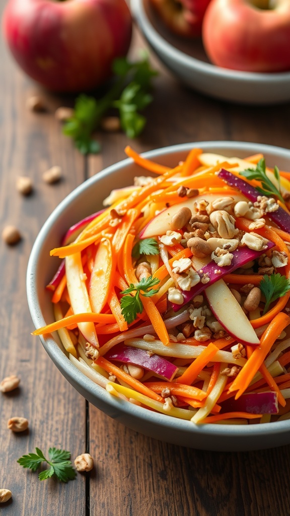 - In a large bowl, combine the julienned carrots and sliced apples.