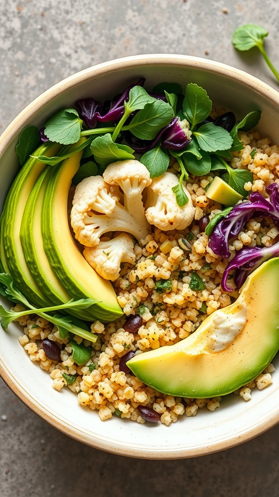 - Assemble the Bowl: In a large bowl, combine quinoa, roasted cauliflower, mixed greens, sliced avocado, and black beans. Toss gently to combine.