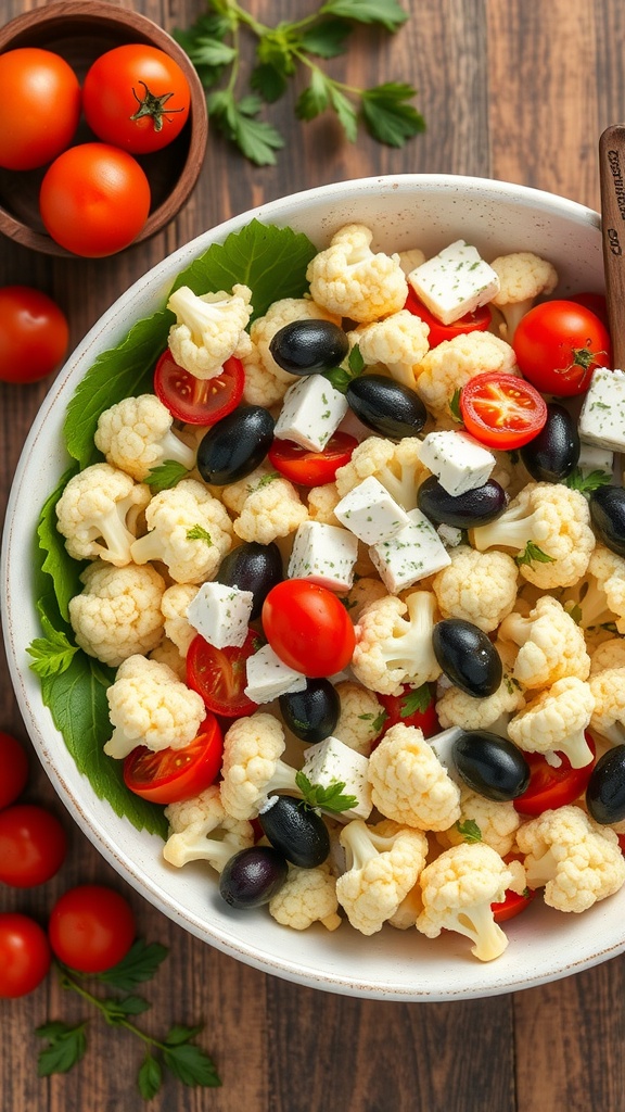 - Combine the salad: In a large mixing bowl, combine the blanched cauliflower, cherry tomatoes, black olives, feta cheese, and chopped parsley. Drizzle the dressing over the salad and toss gently to combine.