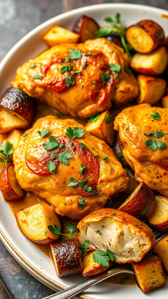 Baked curry chicken thighs are a delightful dish that combines tender chicken with vibrant vegetables. The golden-brown chicken is coated in a rich curry sauce, making it both comforting and satisfying. The accompanying vegetables, roasted to perfection, add a nice crunch and balance to the meal.