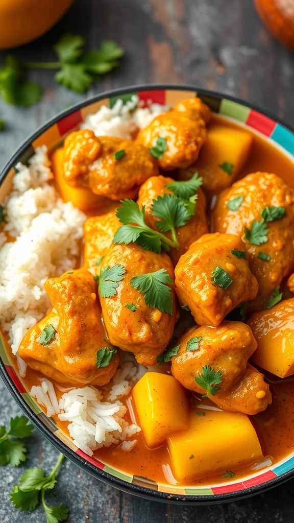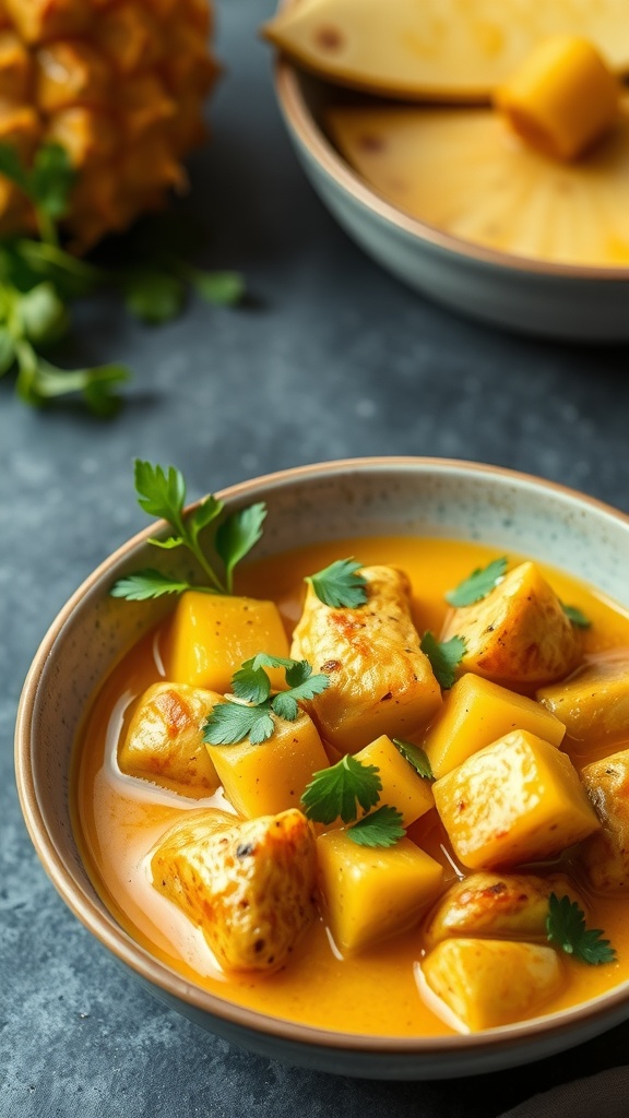 This Coconut Milk and Pineapple Curry Chicken is a delightful dish that combines the sweetness of pineapple with the creaminess of coconut milk. The vibrant colors in the bowl show off tender chicken pieces and juicy pineapple cubes, all enveloped in a rich, golden curry sauce. Fresh cilantro adds a pop of green, making the dish not only tasty but visually appealing.
