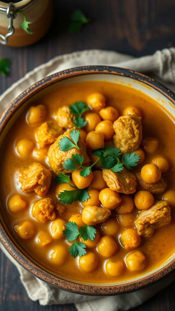This Curry Chicken and Chickpeas Stew is a warm and comforting dish that brings together tender chicken and hearty chickpeas in a rich, flavorful sauce. The vibrant colors of the stew make it as appealing to the eyes as it is to the taste buds. Fresh cilantro adds a pop of green, enhancing both the look and flavor of the dish.