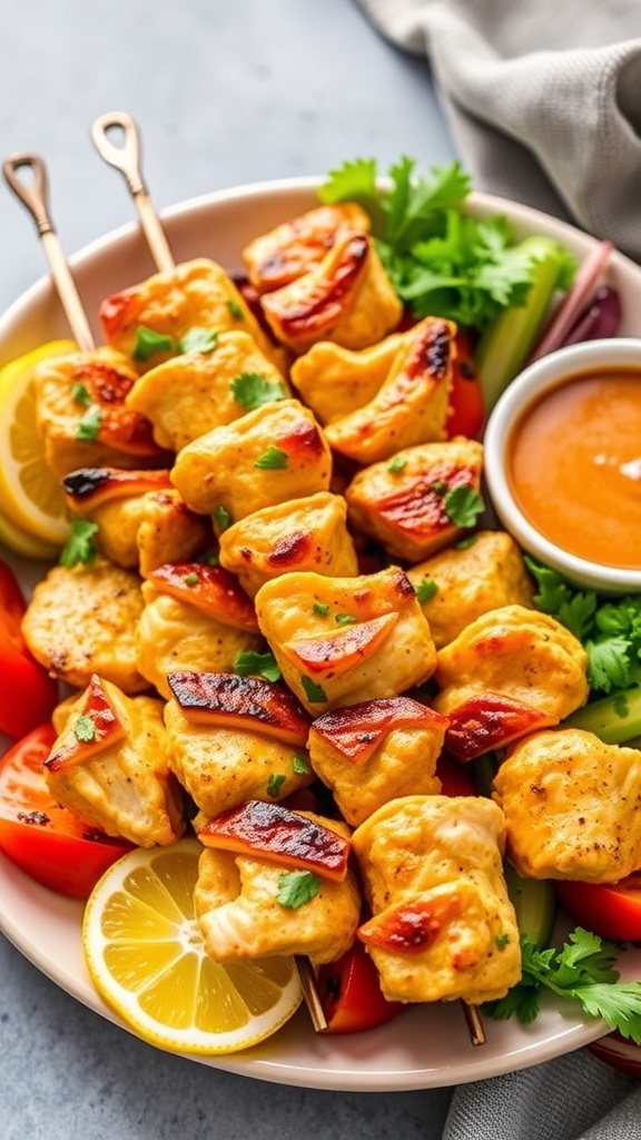 These Lemon Herb Curry Chicken Skewers are a delightful twist on traditional curry dishes. The image showcases beautifully grilled chicken pieces, marinated in a zesty lemon and herb curry blend. The vibrant colors of the skewers, combined with fresh vegetables like cherry tomatoes and cucumber, make for an appealing presentation.