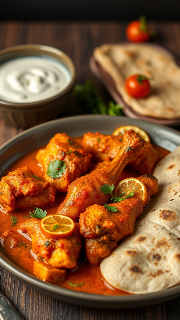 Tandoori Chicken Curry is a delightful dish that brings together the rich flavors of Indian cuisine. The vibrant orange color of the chicken indicates the spices used, like turmeric and paprika, which not only enhance the taste but also make the dish visually appealing. The tender chicken pieces are marinated in yogurt and spices, then cooked to perfection. This dish is often served with naan, making it a complete meal.