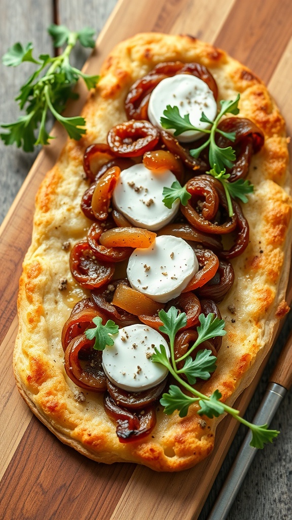 Caramelized onion and goat cheese flatbread is a delightful dish that combines sweet and savory flavors. The image showcases a beautifully baked flatbread topped with rich caramelized onions, creamy goat cheese, and vibrant vegetables. The fresh herbs add a pop of color and freshness, making it not just tasty but visually appealing too.