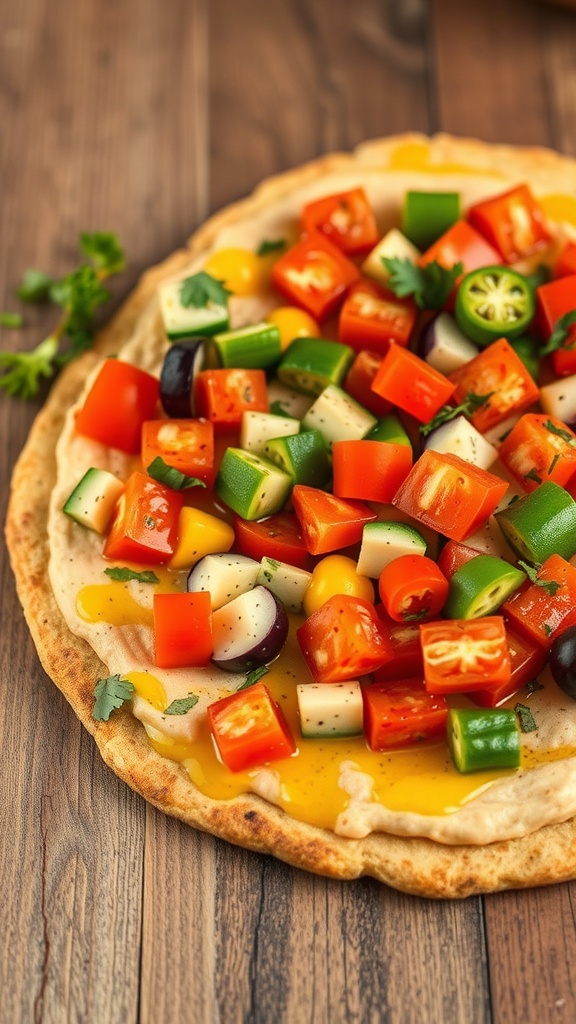- Serve: Cut into slices and serve immediately. Enjoy your fresh and healthy hummus and veggie flatbread!