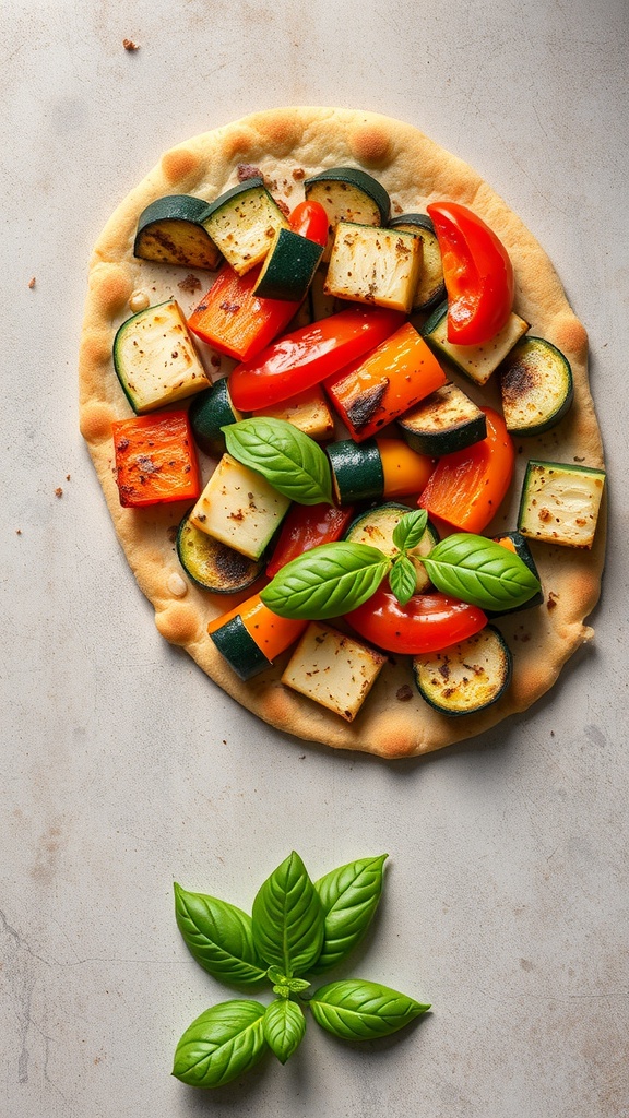 Roasted vegetable flatbread is a colorful and tasty dish that brings together fresh ingredients and delightful flavors. The image shows a flatbread topped with a vibrant mix of roasted zucchini, bell peppers, and cubes of cheese, all garnished with fresh basil leaves. This combination not only looks appealing but also offers a wonderful blend of textures and tastes.