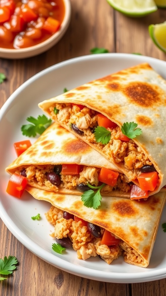 Chicken and bean quesadillas are a tasty and easy meal option that everyone loves. The image shows golden, crispy quesadillas filled with ground chicken and black beans. They are served with fresh salsa and a side of crunchy cucumber. This dish is perfect for a quick lunch or a cozy dinner.