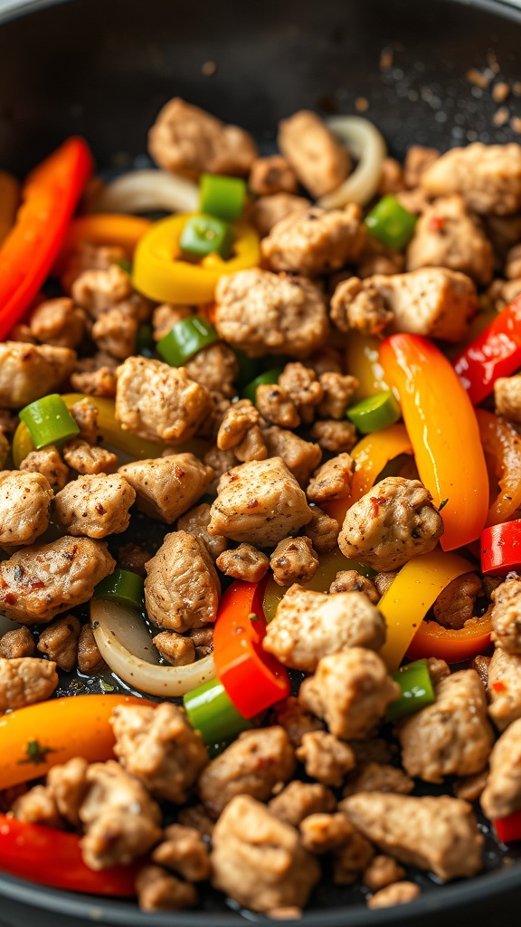 Ground chicken stir-fry is a quick and tasty meal that brings together lean protein and colorful veggies. In the image, you can see ground chicken sizzling in a pan, surrounded by vibrant bell peppers and green onions. The steam rising adds to the excitement of cooking this delicious dish.