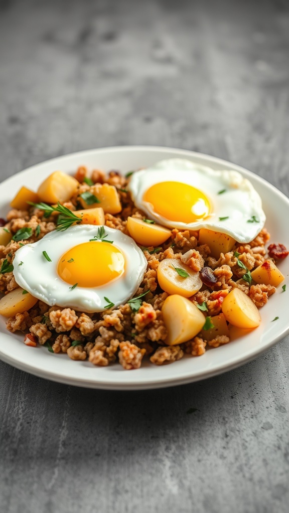Ground chicken and potato hash is a simple yet satisfying dish. It combines the lean protein of ground chicken with tender potatoes, making it a hearty meal. The image shows a delicious plate of this hash topped with perfectly cooked eggs. The golden yolks add richness and flavor, making it an ideal breakfast or brunch option.