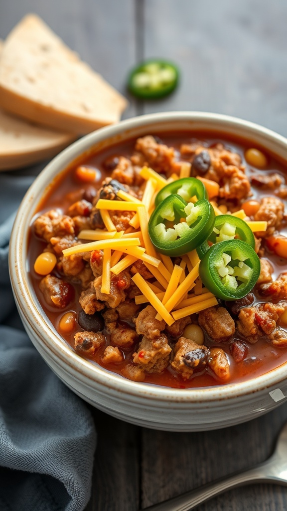 Ground chicken chili is a delicious twist on a classic dish. This hearty meal is perfect for chilly nights or casual gatherings. The image showcases a warm bowl of chili, topped with shredded cheese and fresh jalapeños, inviting you to dig in. The rich colors of the chili and toppings make it look as good as it tastes.