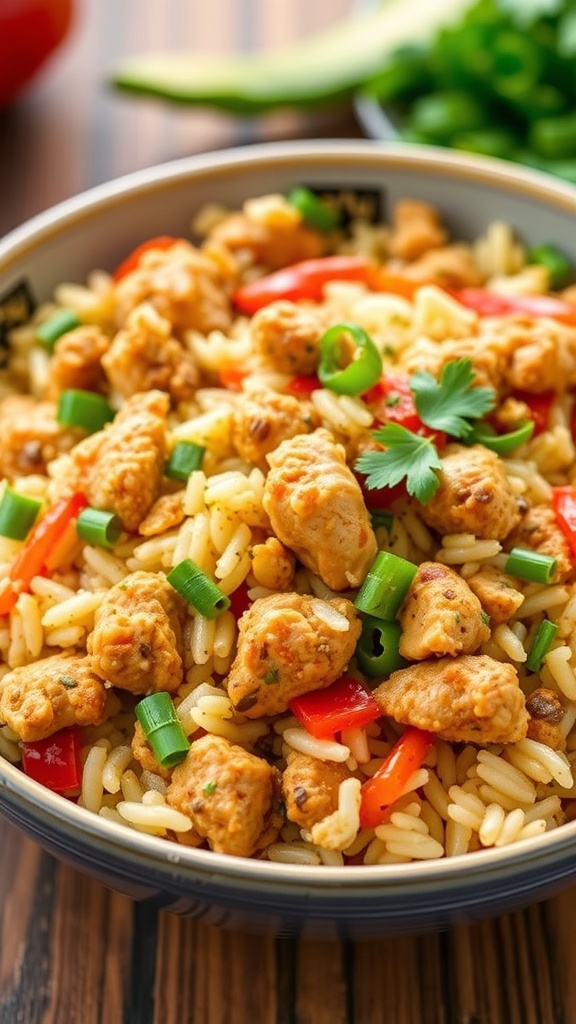 Chicken and Vegetable Fried Rice is a delightful dish that brings together the goodness of ground chicken and fresh veggies. This meal is not only colorful but also packed with flavor. The vibrant mix of green beans, red peppers, and tender chicken makes it visually appealing and appetizing.