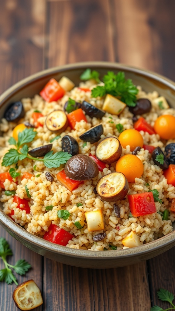 Roasted Vegetable Couscous Salad is a colorful and nutritious dish that brings the flavors of Morocco right to your table. The image showcases a vibrant mix of roasted vegetables, including bell peppers, eggplant, and zucchini, all tossed with fluffy couscous. The bright colors not only make it visually appealing but also hint at the fresh flavors waiting to be enjoyed.