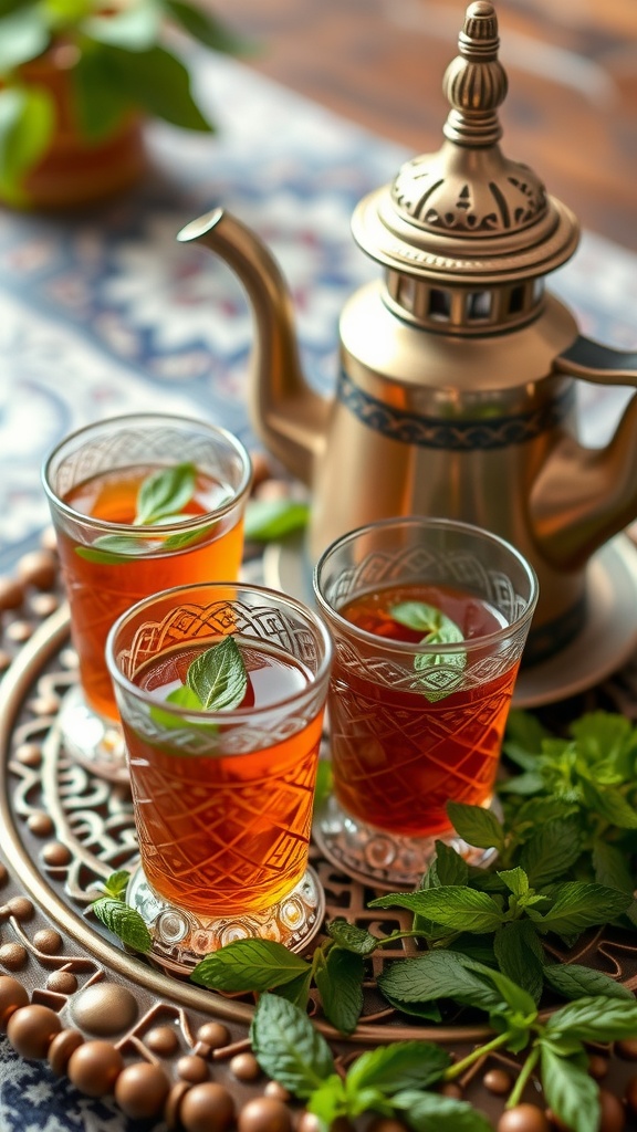 Moroccan mint tea is more than just a drink; it’s a cherished tradition. The ritual of preparing and serving this tea is a beautiful blend of hospitality and culture. Picture a shiny teapot, often made of silver or brass, sitting on a decorative tray. Surrounding it are glasses filled with vibrant amber tea, each garnished with fresh mint leaves. This scene captures the essence of Moroccan gatherings.
