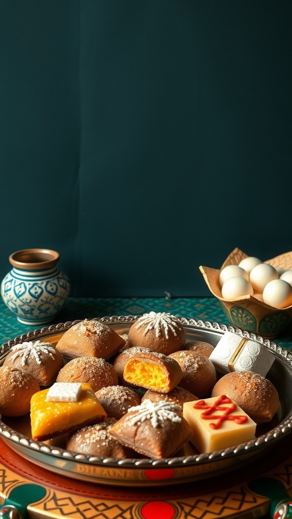 The platter showcases a variety of sweets, including delicate pastries filled with almond paste, honey-soaked treats, and colorful confections. The intricate designs and vibrant colors make these sweets visually appealing, inviting everyone to indulge. Each bite offers a delightful mix of flavors, from the nutty richness of almonds to the sweetness of honey and the warmth of spices.