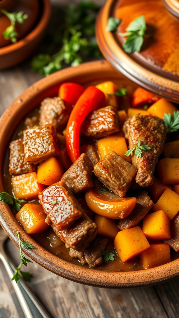The image showcases a beautiful tagine filled with succulent pieces of meat, vibrant bell peppers, and sweet squash. The colors are inviting, making it hard to resist. Each ingredient adds its own character, creating a delightful balance of taste and texture.