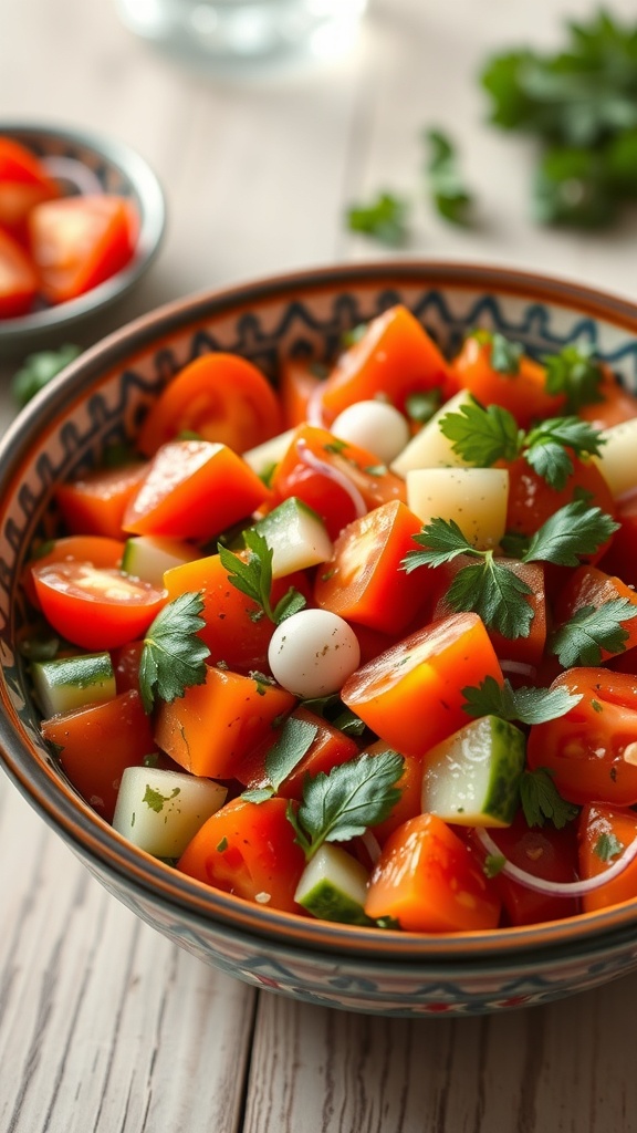 This Moroccan salad is a burst of color and flavor. Fresh tomatoes, cucumbers, and herbs come together in a beautiful bowl, making it a perfect side dish for any meal. The vibrant reds and greens create an inviting look that’s hard to resist.