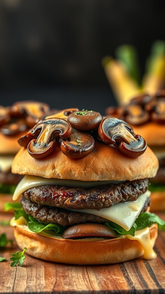 - Assemble the Burgers: Toast the burger buns if desired. Layer leafy greens on the bottom bun, followed by the cheesy patty, a generous scoop of sautéed mushrooms, and the top bun.