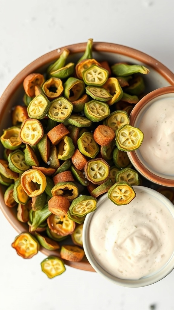 - Remove from the oven and let cool slightly before serving. Enjoy your crispy okra chips with a dip or on their own!