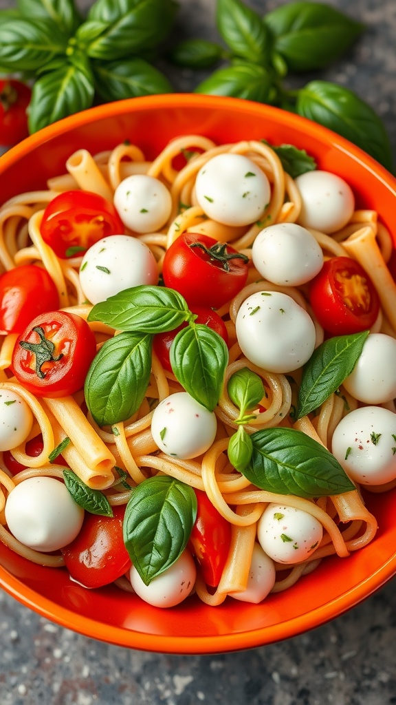 - Mix the Salad: In a large bowl, combine the cooled pasta, cherry tomatoes, mozzarella balls, and basil.
