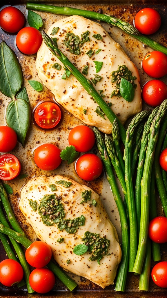 The chicken breasts are seasoned and topped with pesto, then baked alongside asparagus and tomatoes. This method not only keeps the chicken moist but also allows the vegetables to roast to perfection, soaking up all those wonderful flavors.