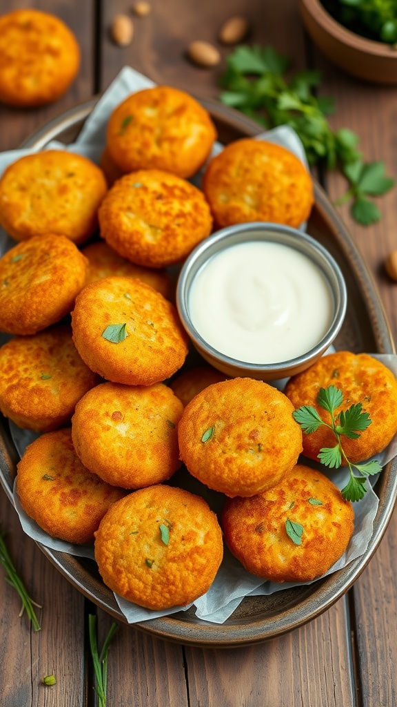 Fresh herbs scattered around can add a pop of color and freshness, making the dish even more inviting. Whether enjoyed as a snack, appetizer, or as part of a larger meal, these croquettes are sure to be a delightful addition to any gathering.