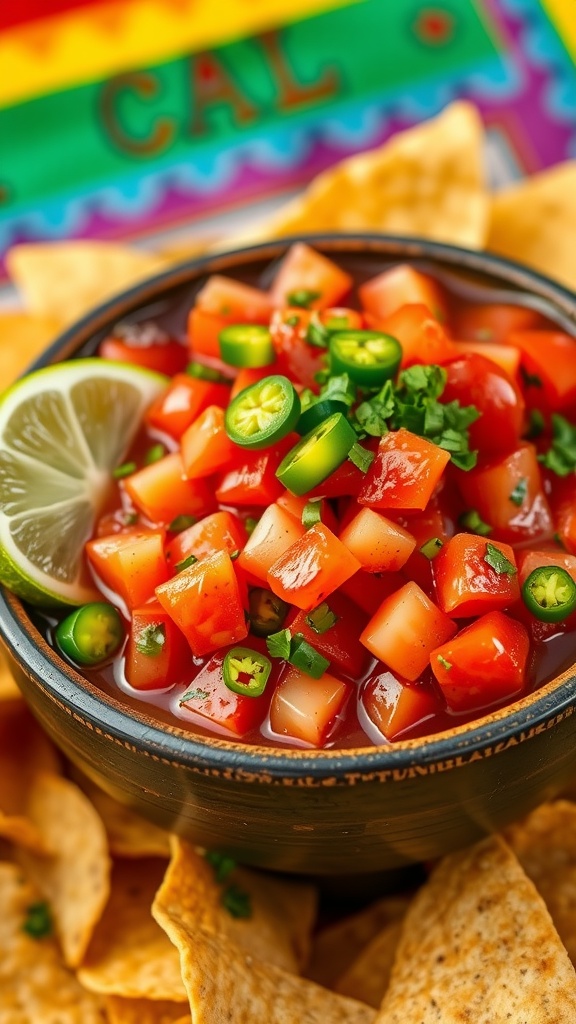 Presentation can elevate the enjoyment of any dish, and serving this salsa in a rustic bowl surrounded by tortilla chips adds to the festive atmosphere. The colorful backdrop, with its vibrant greens and reds, invites guests to dig in and enjoy.