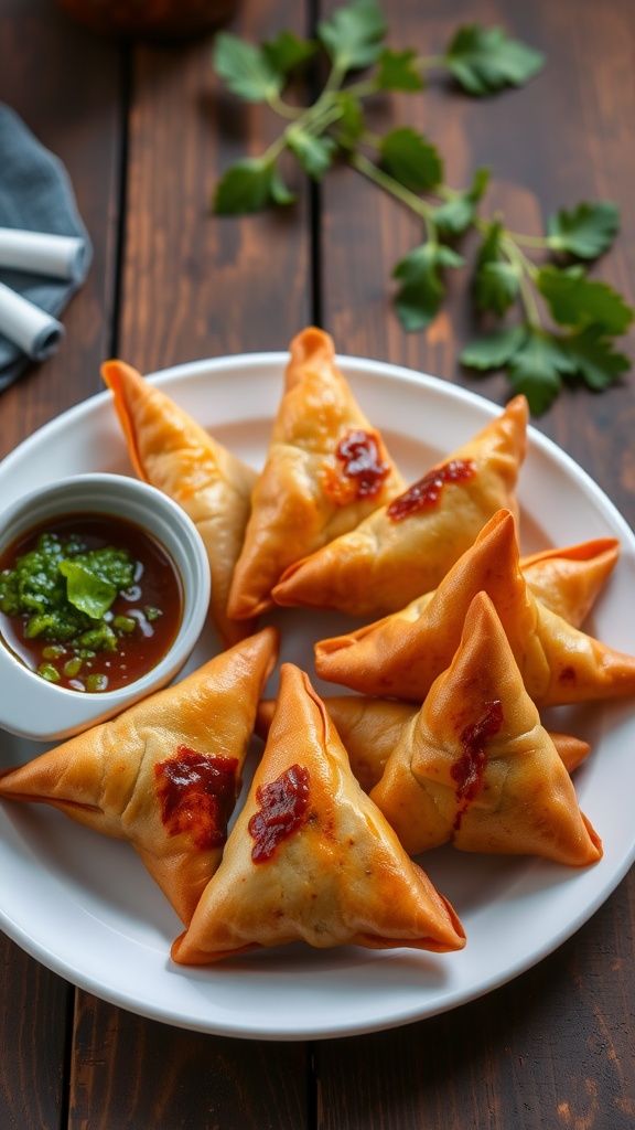 Each samosa showcases the classic triangular shape, a hallmark of this beloved snack. The presentation is often enhanced by a small bowl of vibrant green mint chutney and rich, dark tamarind chutney, ready to complement the flavors with each dip.