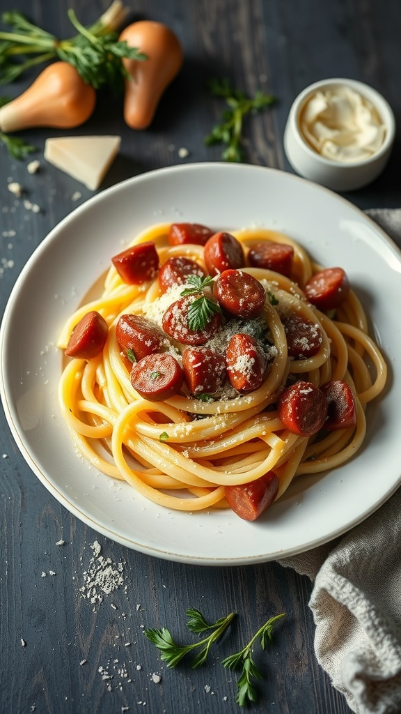 - Combine with Pasta: Toss the cooked spaghetti with the sausage mixture until well coated. Serve hot, garnished with fresh basil leaves.