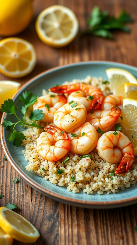 - Serve: Fluff the cooked quinoa with a fork and divide it among plates. Top with the garlic lemon shrimp and garnish with fresh parsley. Enjoy!
