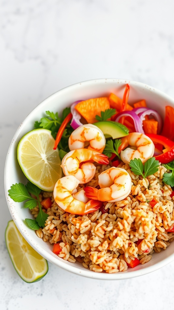 - Assemble the Bowl: In a large bowl, layer the cooked brown rice, followed by the shrimp, diced avocado, bell pepper, cucumber, and red onion.