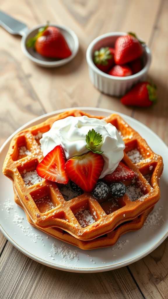 These waffles are versatile too; you can top them with fresh fruits, whipped cream, or even a drizzle of maple syrup for sweetness. Whether you enjoy them plain or loaded with toppings, these waffles are sure to please everyone at the table.