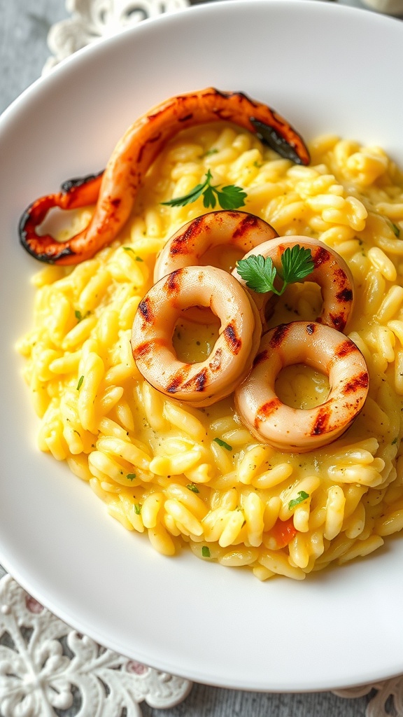 - Grill the Squid: While the risotto cooks, heat a grill pan over medium-high heat. Toss the squid with olive oil, salt, and pepper, then grill for 2-3 minutes until cooked through.