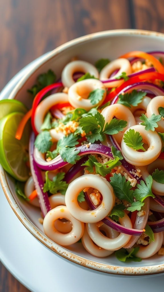 - Combine Ingredients: In a large bowl, toss the cooked squid, bell pepper, cilantro, and mint. Drizzle the dressing over the salad and mix well.