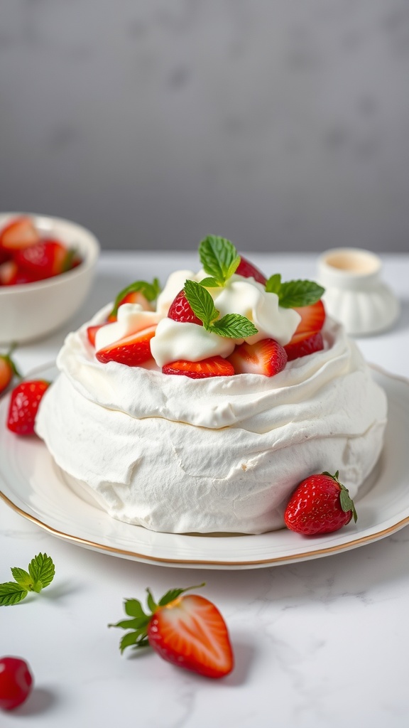 Strawberry Pavlova with Whipped Cream and Mint