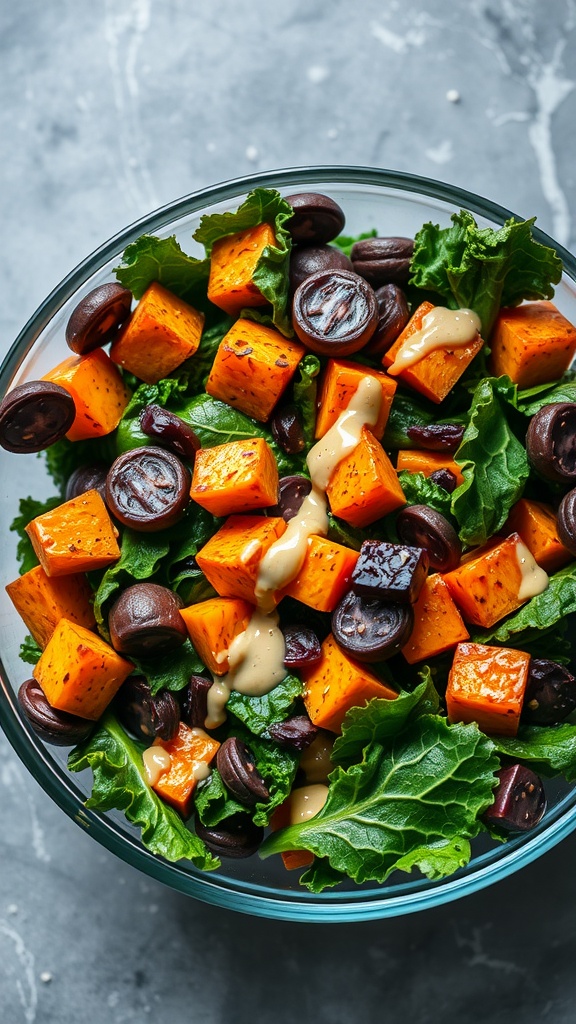 Simple to prepare, this salad can be ready in no time. Just roast the sweet potatoes, mix in the kale, and drizzle with tahini dressing for a vibrant and colorful meal that’s sure to please.