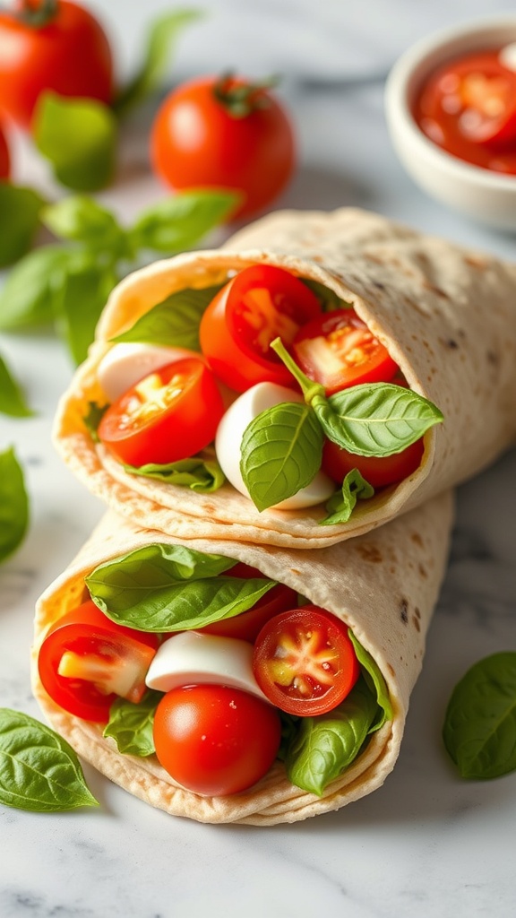 In the image, you can see a delicious wrap filled with vibrant red tomatoes, white mozzarella, and bright green basil. The colors are not just appealing; they also represent the fresh ingredients that make this dish so delightful. The wrap is easy to hold and eat, making it a great choice for picnics or quick lunches.