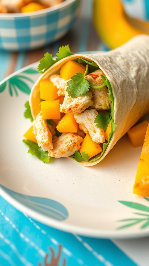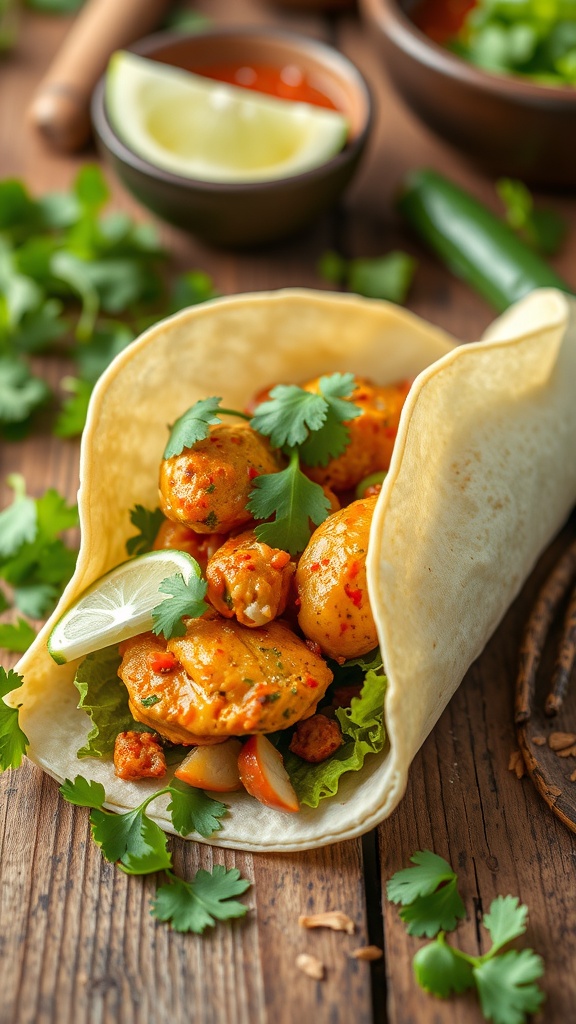 Chili lime chicken wraps are a tasty and easy meal option. The image shows a delicious wrap filled with vibrant, spicy chicken, fresh cilantro, and a hint of lime. The warm tortilla holds everything together, making it perfect for lunch or a quick dinner.