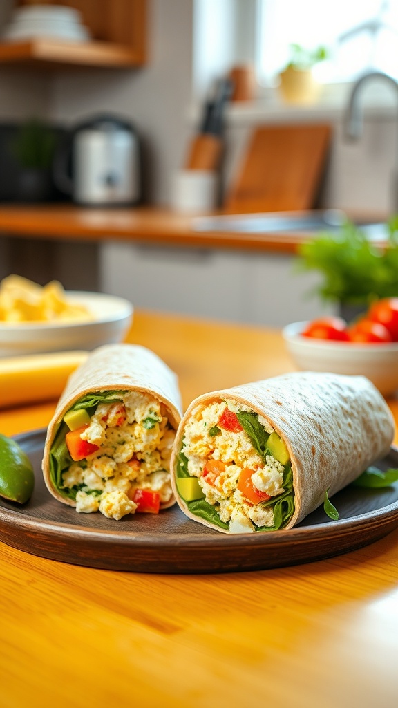 The image showcases two wraps filled with a colorful mix of ingredients. You can see the vibrant green of the spinach, the bright red of diced tomatoes, and the creamy yellow of the egg salad. This wrap not only looks good but also packs a nutritious punch.