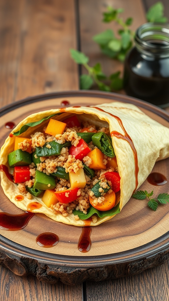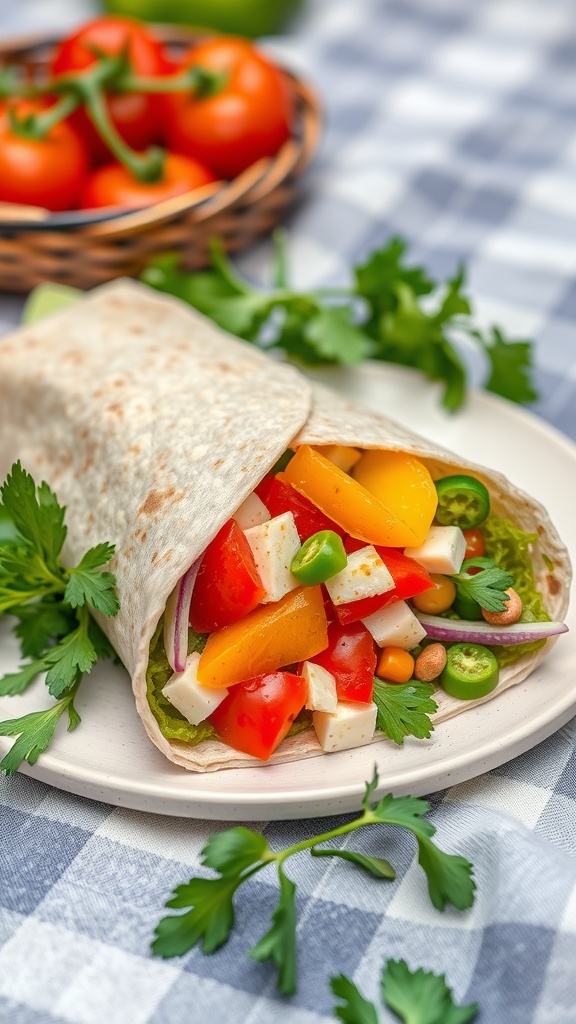 This veggie and cheese wrap is a colorful and tasty option for lunch or a quick snack. The image shows a soft tortilla filled with fresh vegetables and cheese, making it look both inviting and delicious. The vibrant colors of the peppers and greens pop against the light tortilla, hinting at the fresh flavors inside.