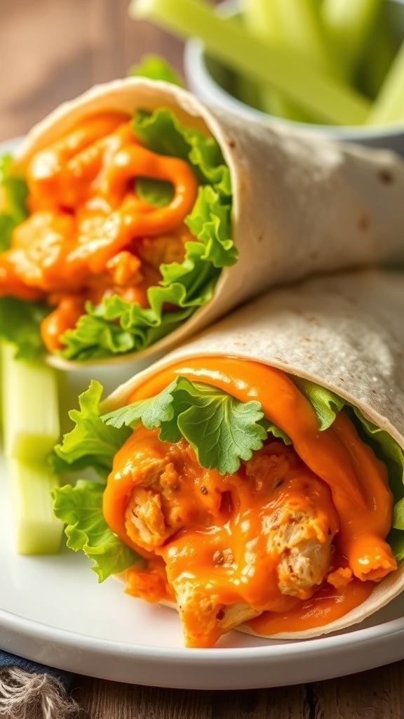 The vibrant colors of the lettuce and chicken pop against the backdrop of the tortilla. With a side of crunchy celery sticks and a small bowl of extra buffalo sauce, this dish is not just a meal; it’s an experience. The heat from the buffalo sauce pairs perfectly with the coolness of the lettuce, creating a delightful contrast.